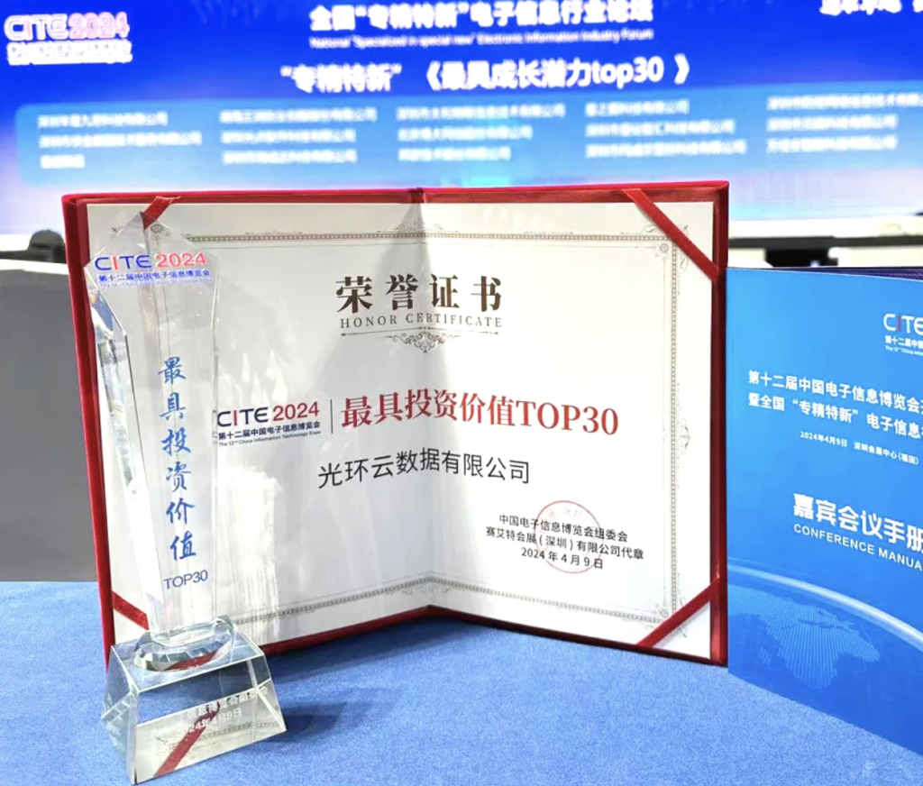 4月9日,光环云荣获第十二届中国电子信息博览会专精特新《最具投资价值TOP30》奖项,在智算云网服务领域再次受到行业肯定!2024年4月9日,第十二届中国电子信息博览会(CITE 2024)在深圳会展中心隆重揭幕。作为电子信息产业的权威展示平台,本届博览会吸引了千余家中外企业汇聚一堂,聚焦于智慧家庭、新型显示、高端半导体、信创、大数据与存储、特种电子、人工智能、绿色消费电子、基础元器件等行业等热点领域,全方位展示了电子信息领域的新产品新技术。