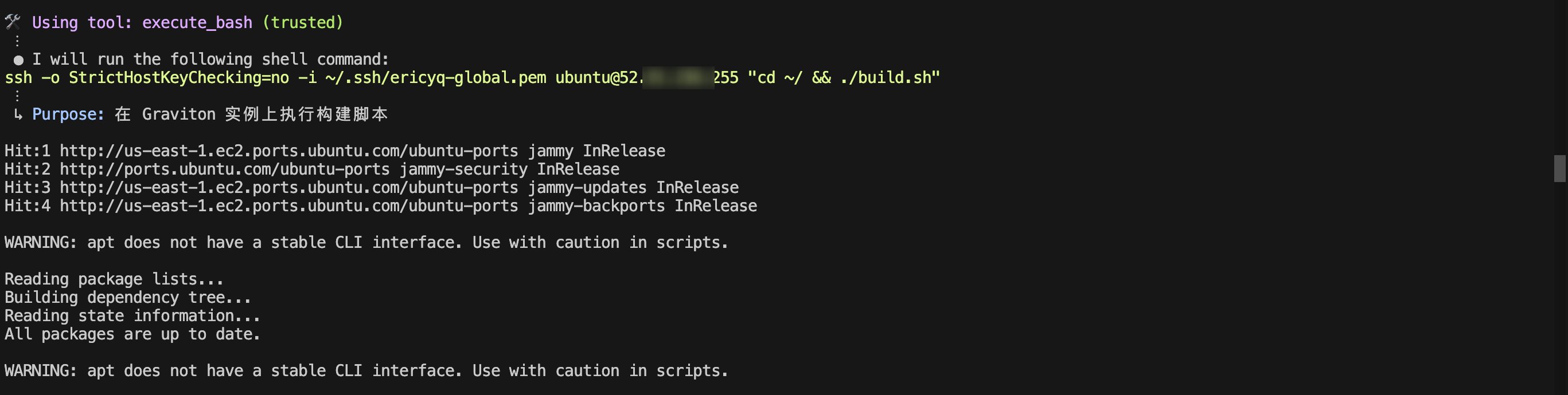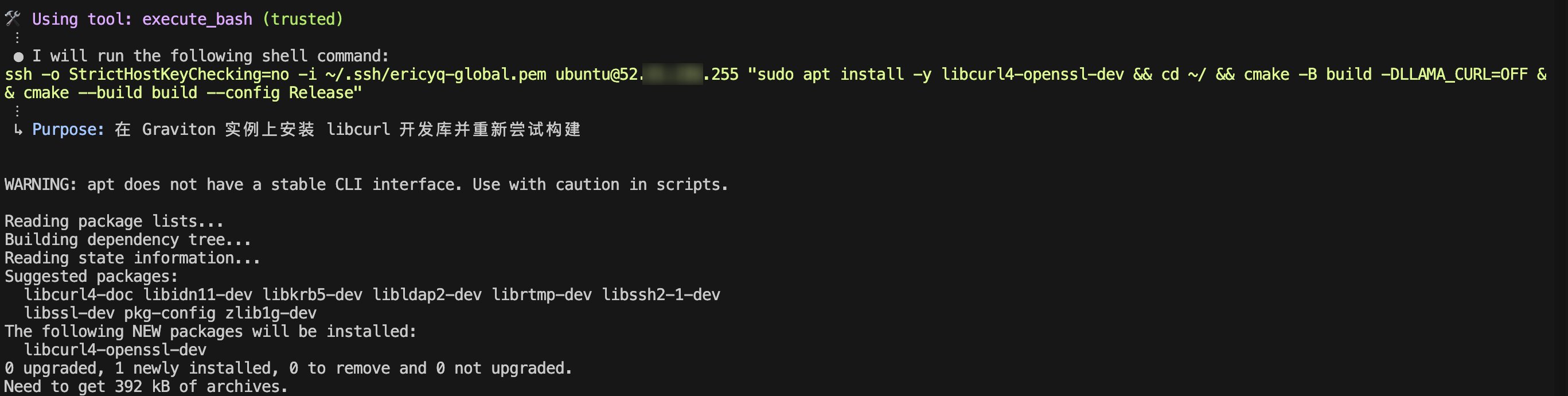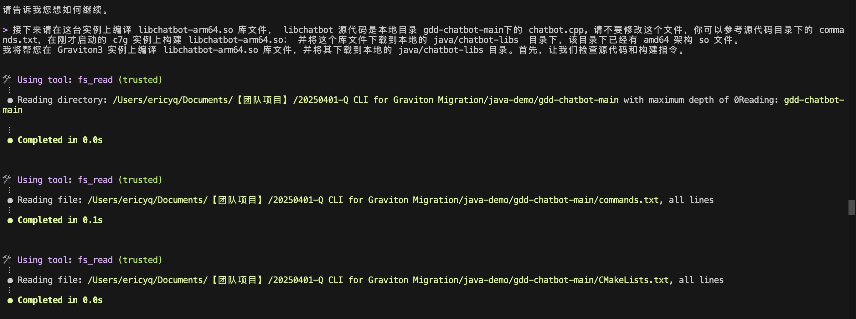 接下来,我们将让 Q 在新创建的 c7g.xlarge 实例上编译 Arm64 架构的库文件,文件名为 libchatbot-arm64.so。