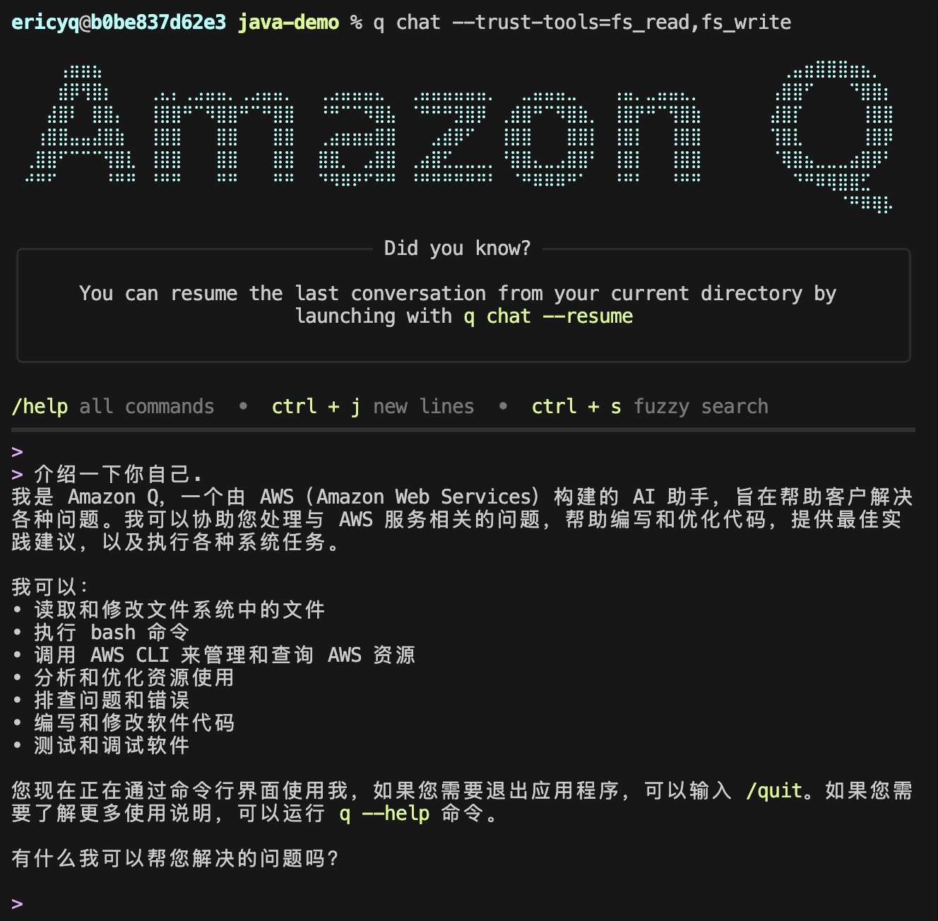 以 java-demo 目录作为工作目录,从该路径启动 Q CLI 对话窗口,输入提示词: