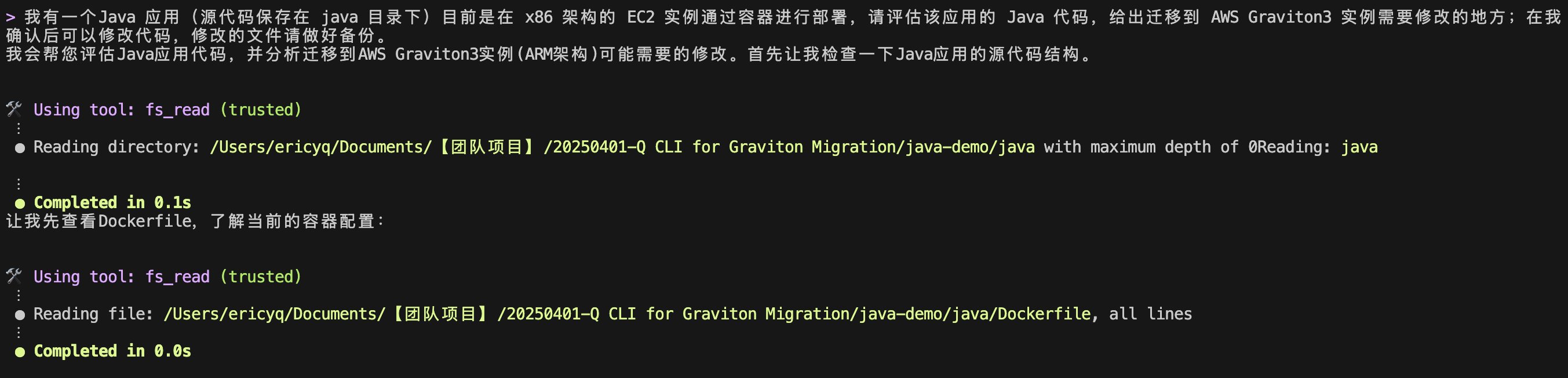 将通过一个实际的 Java 演示应用为例,带您一步步探索如何借助 Q CLI 的强大功能,轻松识别潜在的迁移障碍,获取针对性的解决方案建议,并最终实现应用在 Graviton 平台上的顺利部署与运行。从依赖分析到代码适配,从构建多架构镜像到应用部署,这将是一次从 x86 到 ARM 架构的完整迁移实战之旅。无论您是考虑大规模微服务迁移,还是评估关键业务应用的架构转换,这篇文章都将为您提供实用的技术指导和决策参考。
