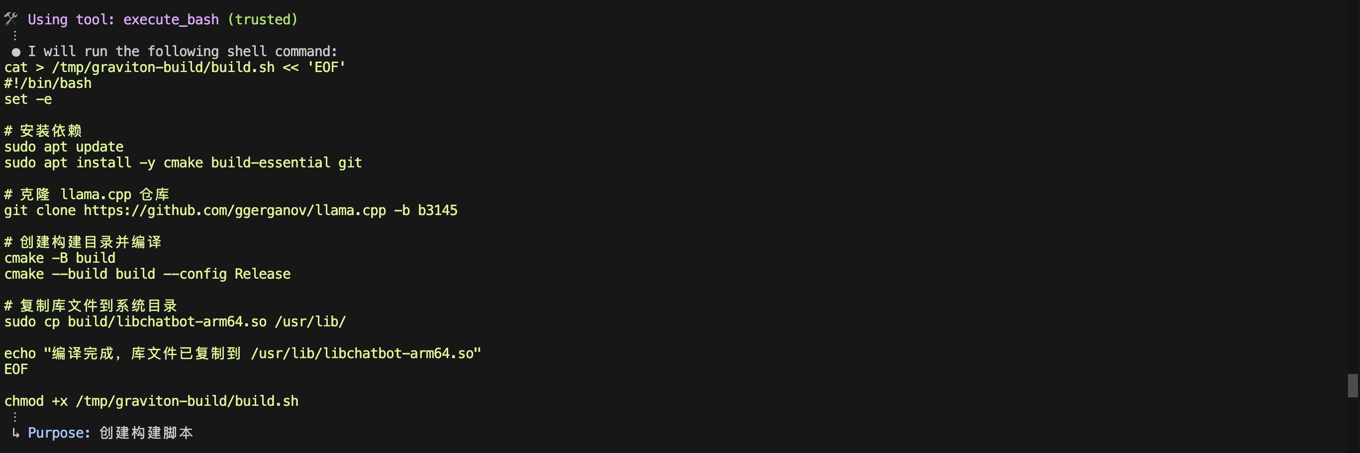 请在该实例上编译libchatbot-arm64.so库文件。libchatbot源代码位于本地目录gdd-chatbot-main/chatbot.cpp中,请勿修改。您可以参考源代码目录中的commands.txt和CMakeLists.txt文件,在我们刚启动的c7g实例上构建libchatbot-arm64.so。然后将该库文件下载到本地java/chatbot-libs目录,该目录已包含amd64架构的.so文件。