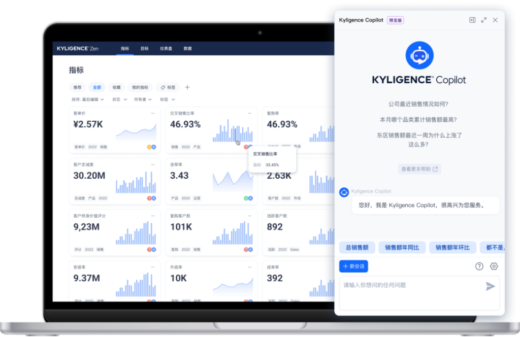 在全民化的生成式AI趋势下,将大模型和大数据结合,用AI帮助企业提升数据使用效率、加速数据驱动业务决策,正在成为企业数智化转型的重要目标。本次双方的战略合作,将能为企业客户提供一站式大数据与大模型应用解决方案,支持快速部署快速见效,同时双方正在探索软硬一体机和托管模式,进一步解决企业客户的算力和运维需求。跬智信息(Kyligence)基于大数据领域和人工智能方面的技术沉淀和行业实践,发布了智能一站式指标平台Kyligence Zen和AI数智助理Kyligence Copilot。Kyligence Copilot在指标平台之上结合大语言模型能力,已基本覆盖了数据分析领域的主流场景如:
