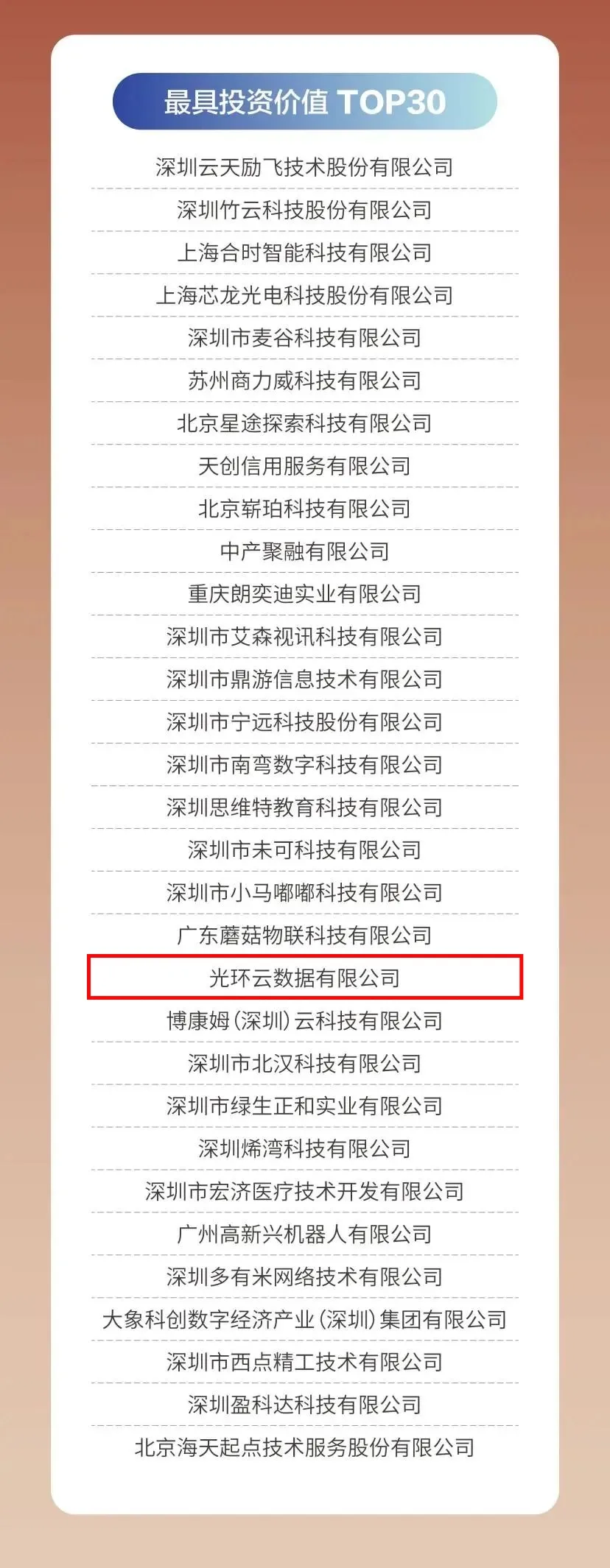 《最具投资价值TOP30》获奖企业名单