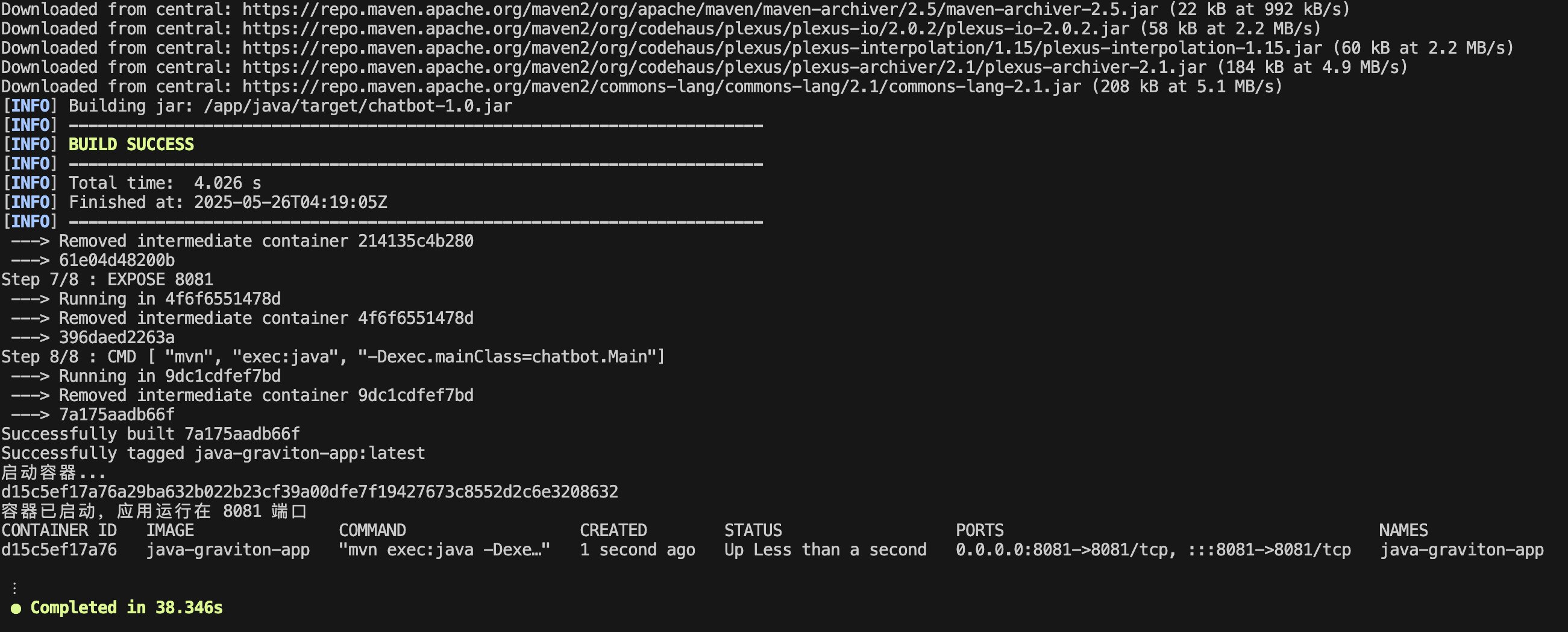 Q 启动后,您可观察到构建 Docker 镜像、启动容器等过程: