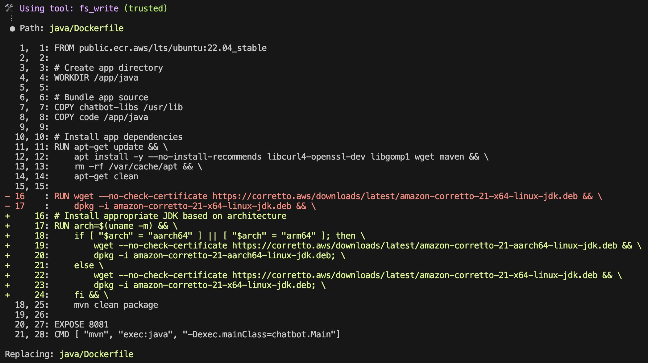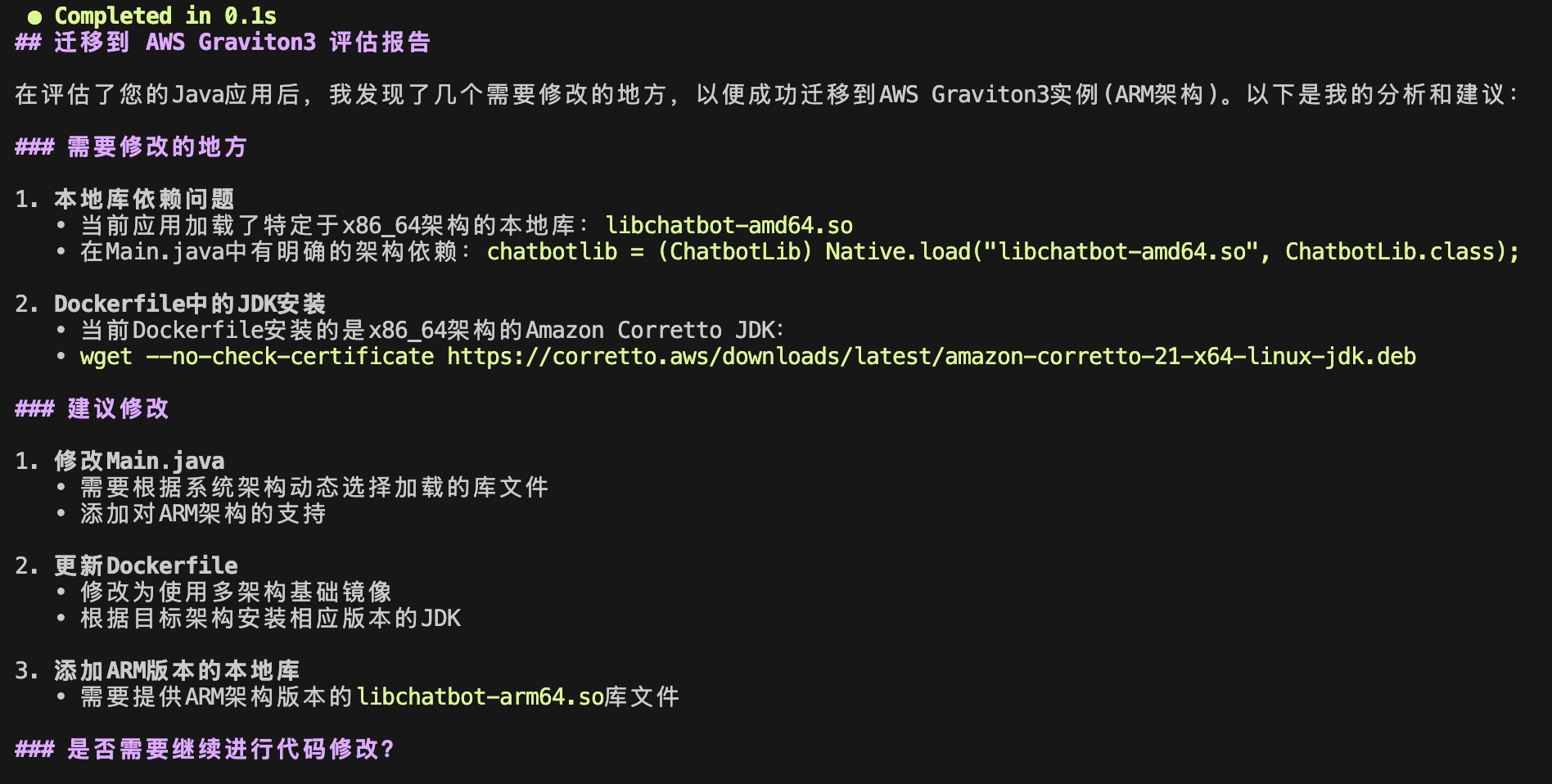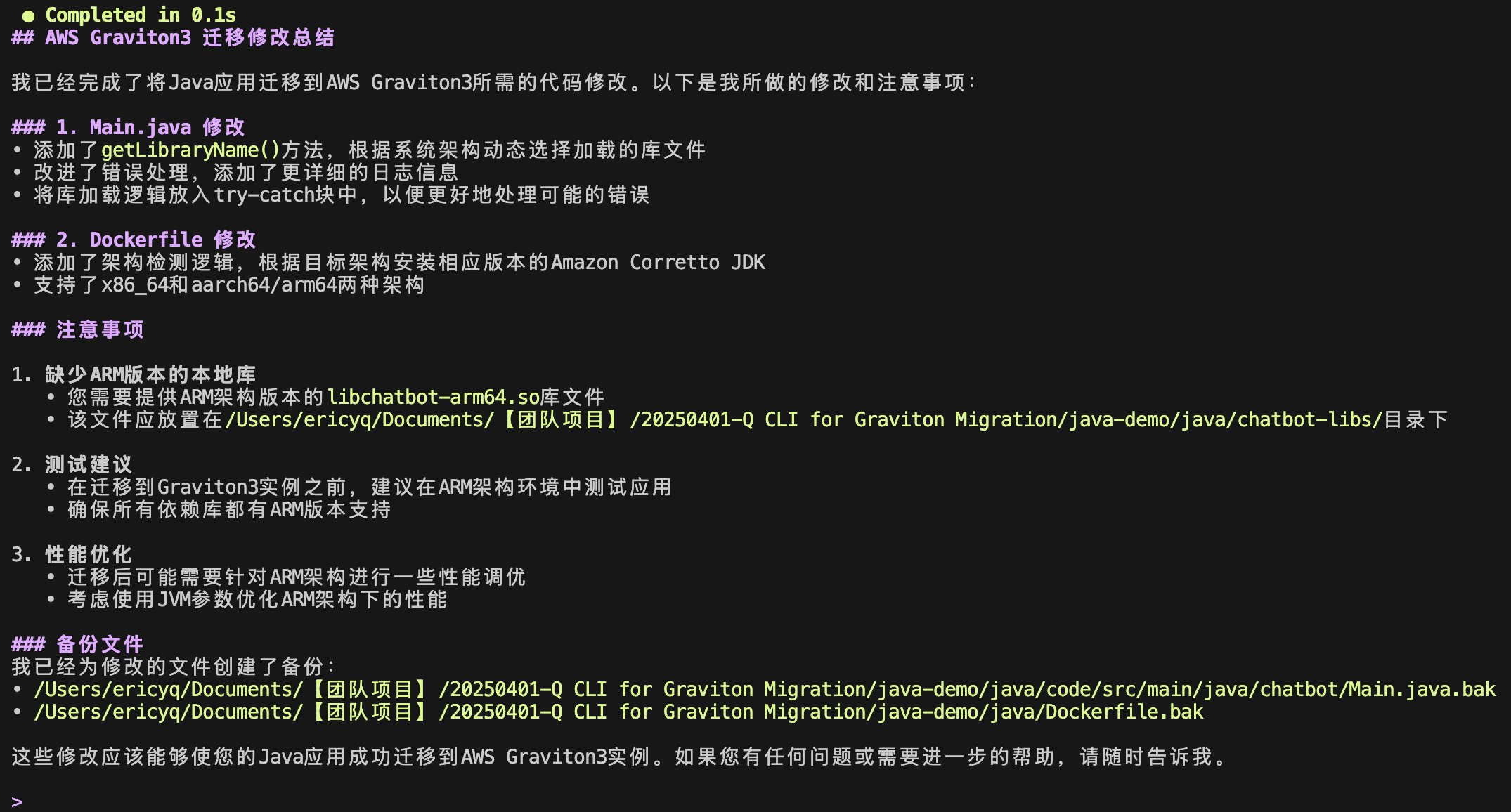 Amazon Q CLI 的出现恰如其分地解决了这一挑战。作为 AWS 最新推出的智能化 AI 助手,Q CLI 将复杂的架构迁移转变为可预测、可操作的工程任务。对于 Java 这类“一次编写,到处运行”的语言,虽然理论上跨架构迁移应当顺畅,但实际过程中常常隐藏着各种依赖兼容性问题和性能优化空间。