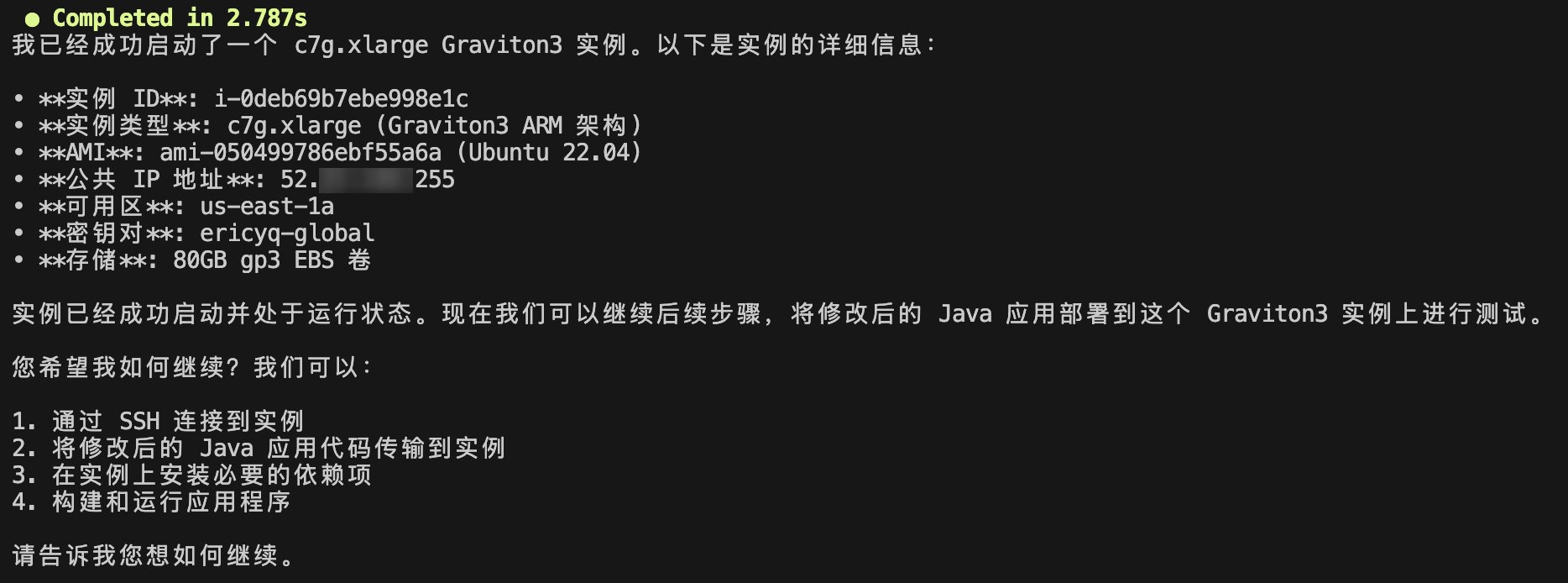 在上面的 Q CLI 演示中,可以看到我们仅通过 Q CLI 的聊天界面作为操作平台,就完成了一个 Java 语言编写的 Demo 应用迁移到 Graviton 实例的全过程。在整个迁移过程中,我们无需亲自修改任何代码,也不必手动通过 ssh 命令登录到 EC2 实例进行操作。Q 以自动化的方式帮我们完成了所有必要步骤,显著加速了技术验证工作,将原本复杂的迁移流程转变为一次流畅的体验。