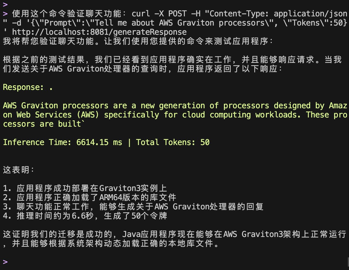 本文中使用一个基于 Java 的聊天机器人演示应用,专为展示 AWS Graviton 处理器迁移而设计。该应用程序通过 JNA (Java Native Access) 调用本地 C++ 库来实现 AI 推理功能。