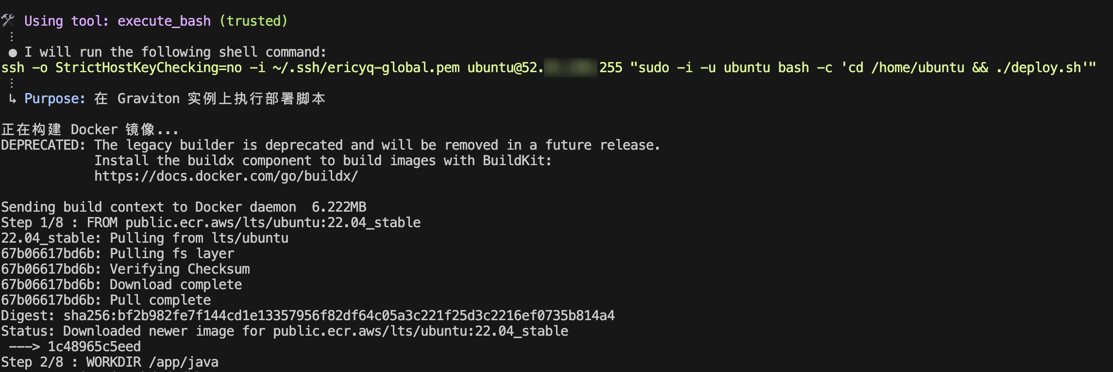 Q 已协助我们完成 Java 源代码修改、Dockerfile 多架构适配(x86_64 和 Arm64)、编译 Arm64 架构的库文件等工作,目前一切准备就绪。 接下来请 Q 在 Graviton 实例上通过容器部署该 Java应用,并验证基础功能。