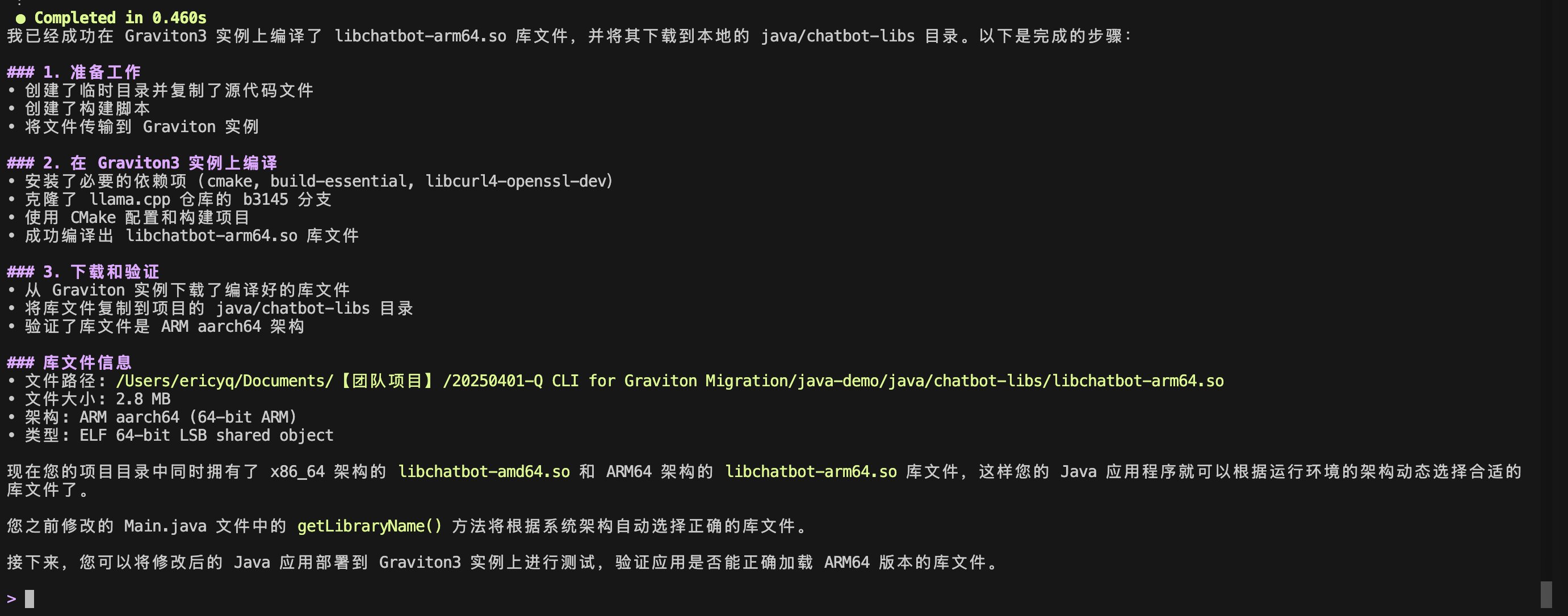 编译完成后,Q 将 libchatbot-arm64.so 文件下载到本地,并提供了执行摘要: