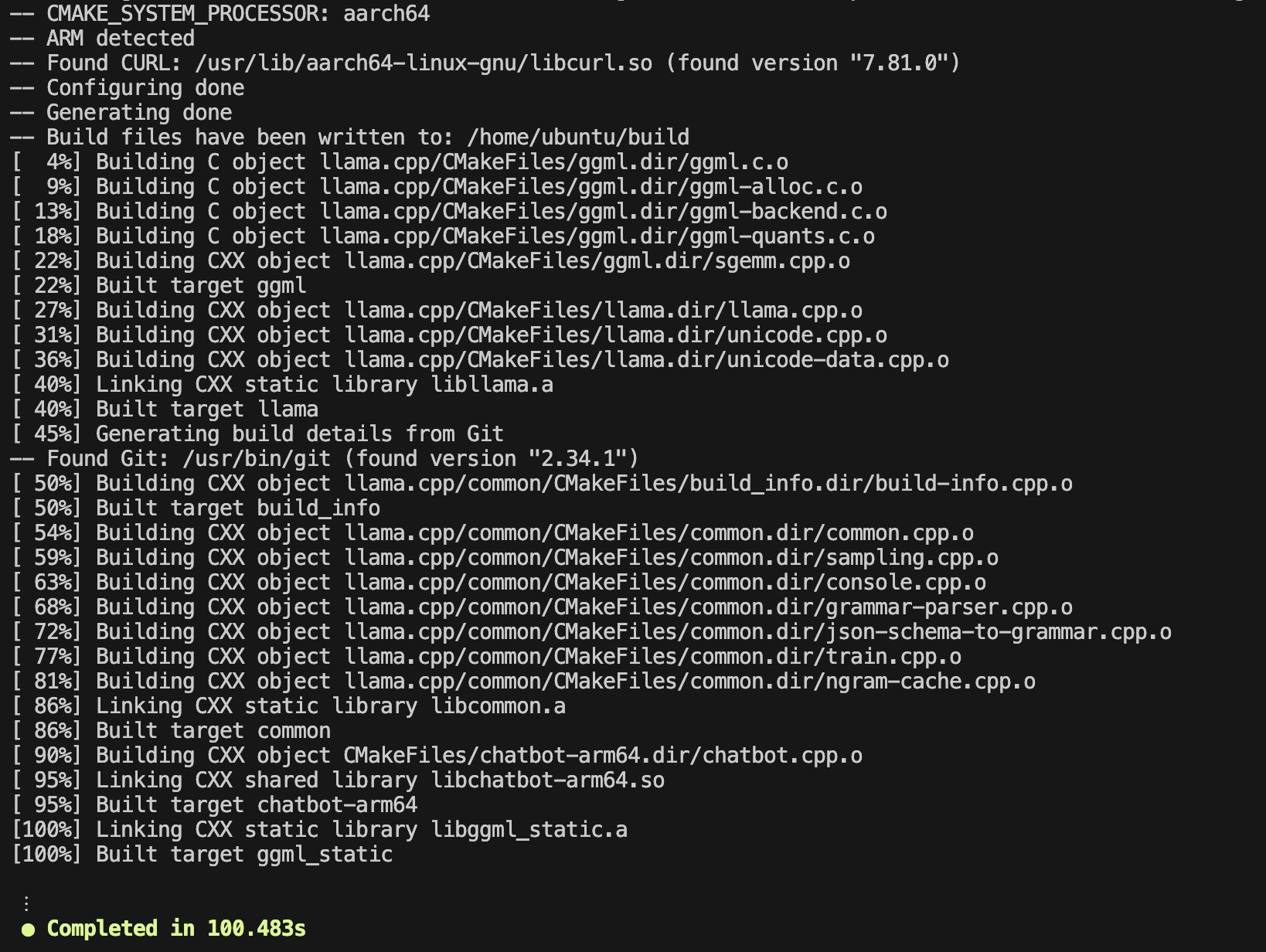 请在该实例上编译libchatbot-arm64.so库文件。libchatbot源代码位于本地目录gdd-chatbot-main/chatbot.cpp中,请勿修改。您可以参考源代码目录中的commands.txt和CMakeLists.txt文件,在我们刚启动的c7g实例上构建libchatbot-arm64.so。然后将该库文件下载到本地java/chatbot-libs目录,该目录已包含amd64架构的.so文件。